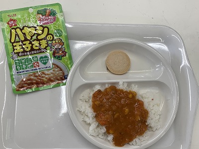 また、防災用に園で備蓄している「ハヤシの王子さま」を食べました。