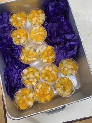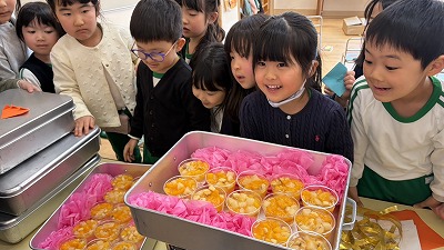 給食室のスタッフさんが「ご卒園おめでとうございます!」と声をかけながら食缶を開けると、そこにはとてもカラフルなゼリーが!周りにはクラスカラーのお花も添えられていて、特別なお祝いのデザートになっていました。