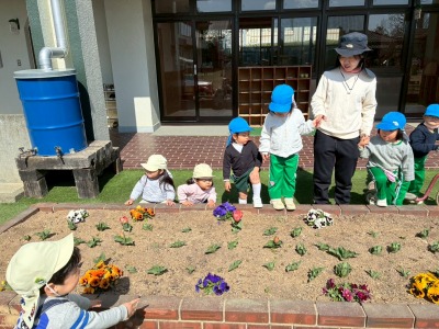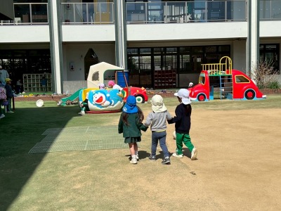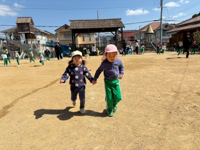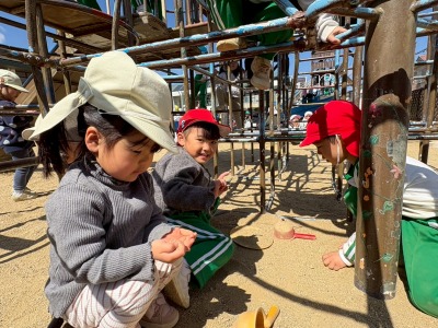 また、お外に遊びに行ったクラスでは、「いっしょにおそとにあそびにいこう!」と靴箱まで一緒についてきてくれる姿もみられました。園庭では、花壇に咲いている花を一緒にみて春探しをしたり、砂で一緒に遊んだりと楽しそうに関わる姿が見られました。