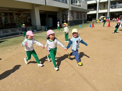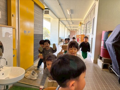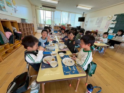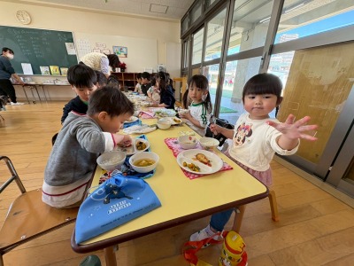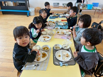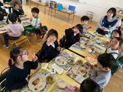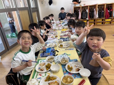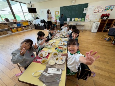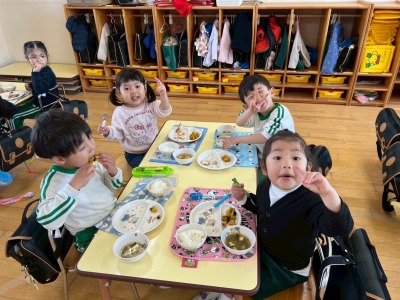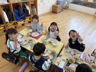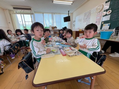 お外でたくさんあそんだ後は、お給食の時間も一緒に過ごしました。年少組のお友だちが準備の仕方を教えてくれたり、「いっしょにたべよう」と優しく声をかけてくれたりと、思いやりあふれる素敵な姿がみられました♡