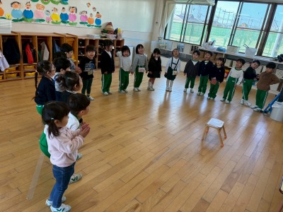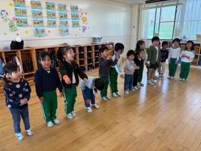 今日は年少組とぽっけ組の交流会第二弾!半日一緒に過ごしました。朝は前回と同じように、年少組とぽっけ組で朝の会を一緒に行いました。