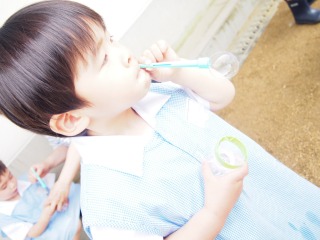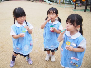 お友達が作ったシャボン玉を「待てまて~」と追いかけて