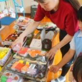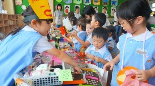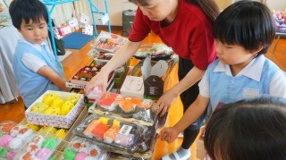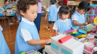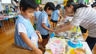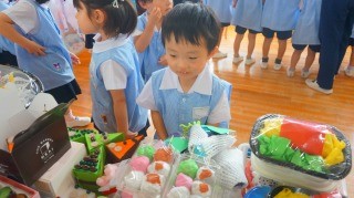 「この商品はここに並べて…」、「これはこっちの方が見えやすいんじゃない?」と、お客さんである年少・年中さんが買いやすいように工夫していました!