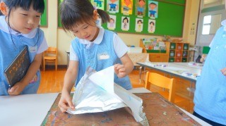 これはアルミホイルと水性ペンを使ってのにじみ絵を楽しんでいます☆「わ~きれい!!」と大喜び!!