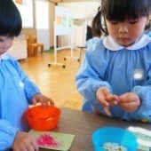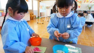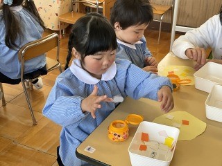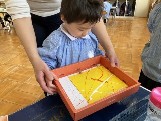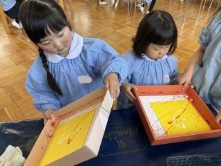 この日は菜の花を作りました!絵の具を付けたビー玉をコロコロ…みんな夢中になって転がしていました♪出来上がったらお部屋に飾りたいと思います☆
