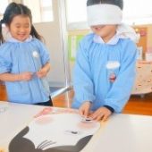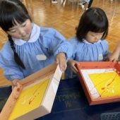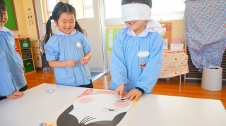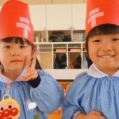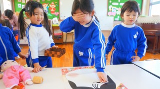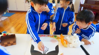 お正月遊びとして幼稚園内では、凧あげ・コマ回しなどをおこないますが、この日はみんなで福笑いをしました☆初めて福笑いをする子どもたちが多くみんな興味津々!!