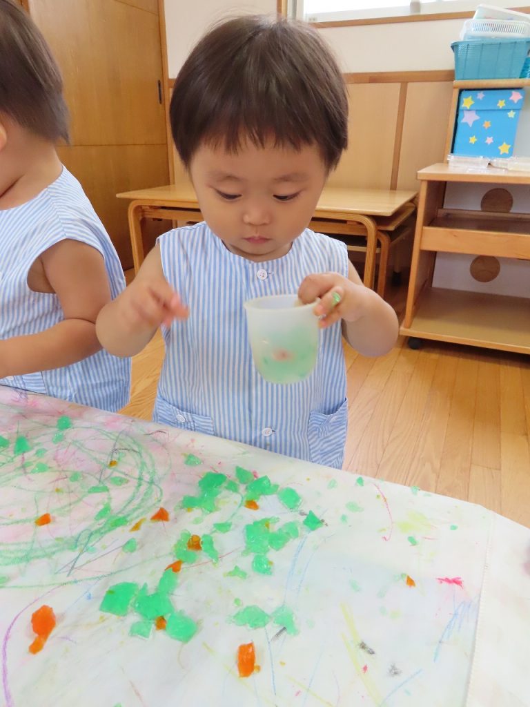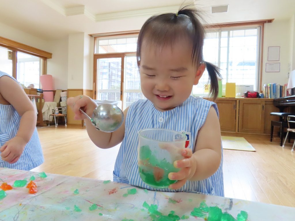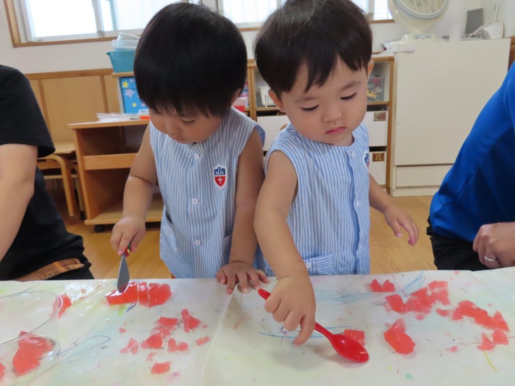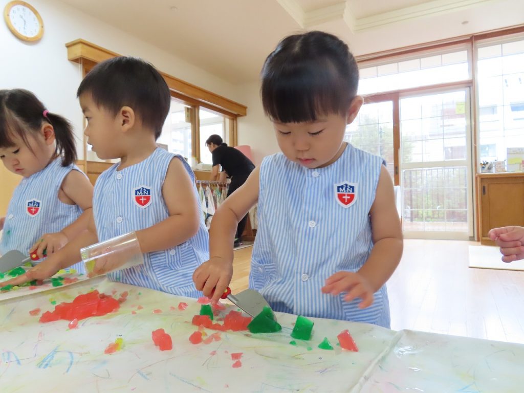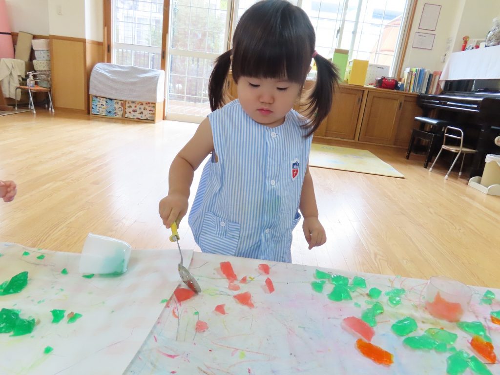 はじめの寒天遊びでは、寒天の感触に少し”ドキッ”としながらも恐る恐る触る子どもたち。素手で触って平気な子どももいれば、おもちゃのスプーンやおたまや包丁でする子どもたちも。