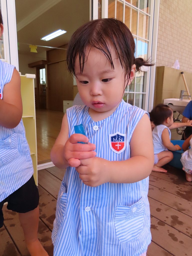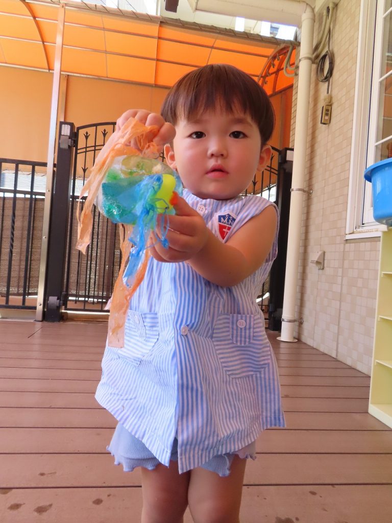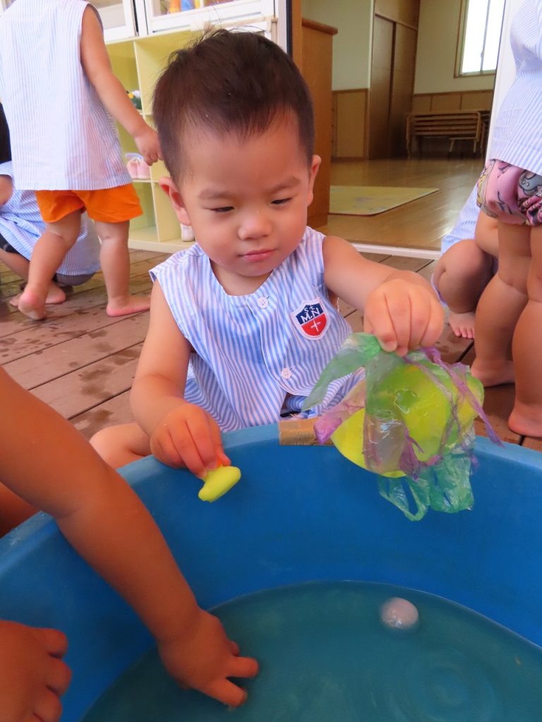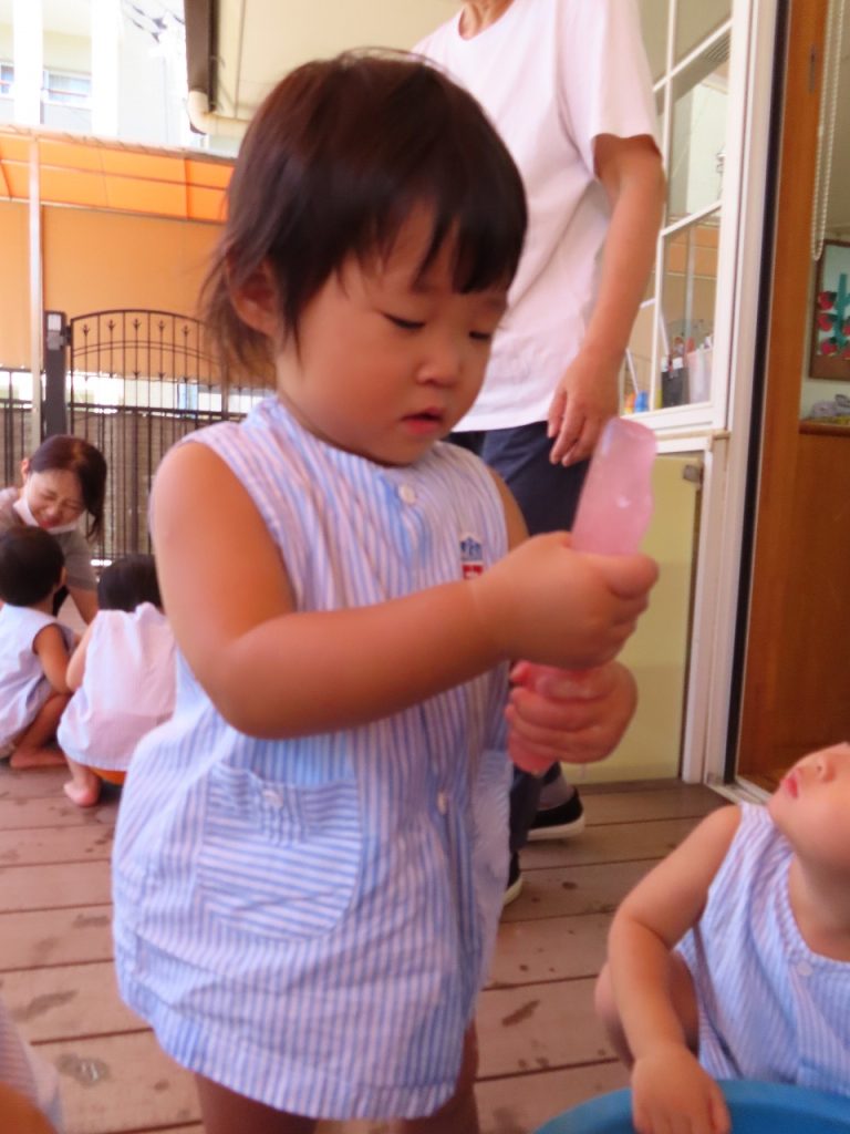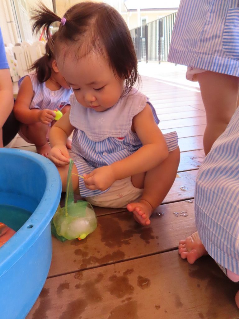次は、冷たくて気持ちいい氷。氷よりもタライの中の水でバシャバシャ。氷の中に玩具のアヒルやすずらんテープが入っていて、はじめは不思議そうに見ていましたが、触り始めると興味津々に…。氷あそびは、氷を触って遊ぶのが中心だと思っていたのになぜか髪の毛がびしゃびしゃ。