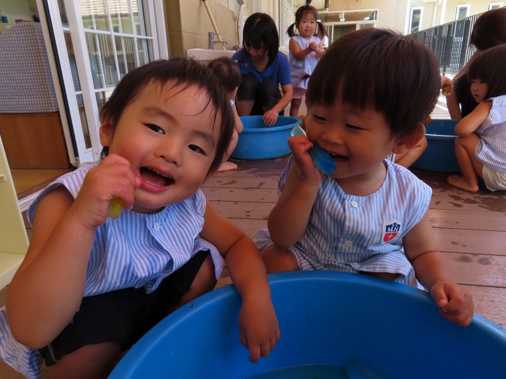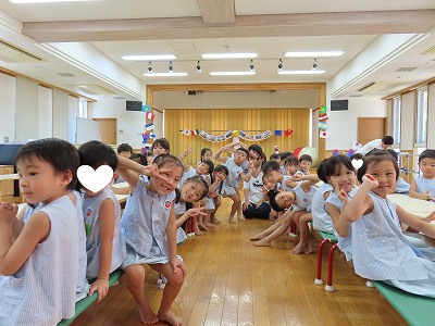 7月。初めての子どもたちも多い中プール遊びが始まり、子どもたちもドキドキワクワクしながら楽しみました。その姿を見てもっとたくさん夏の遊びを取り入れてみよう!と思いました。