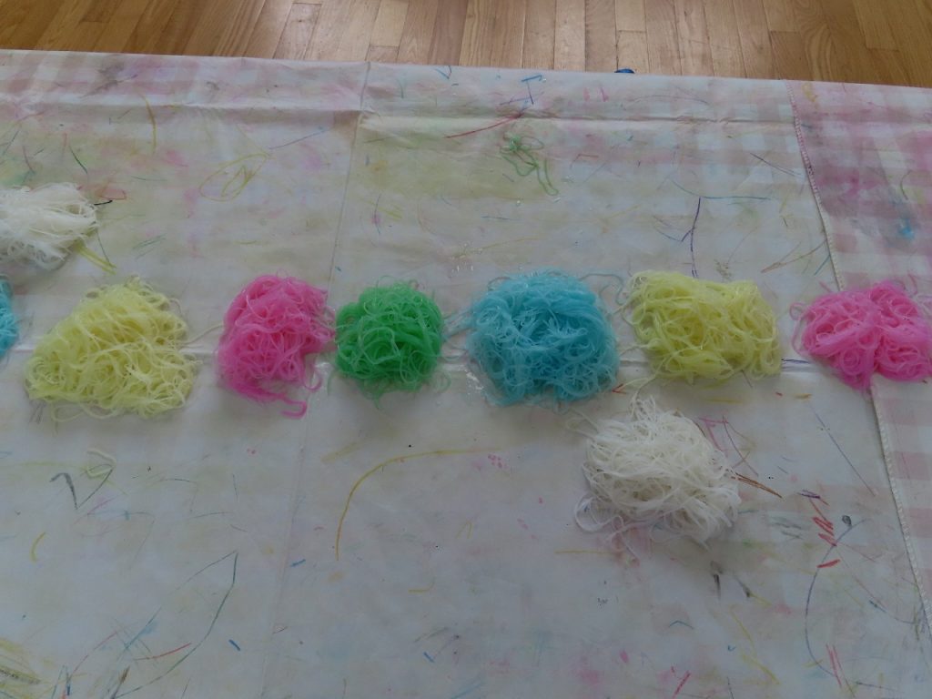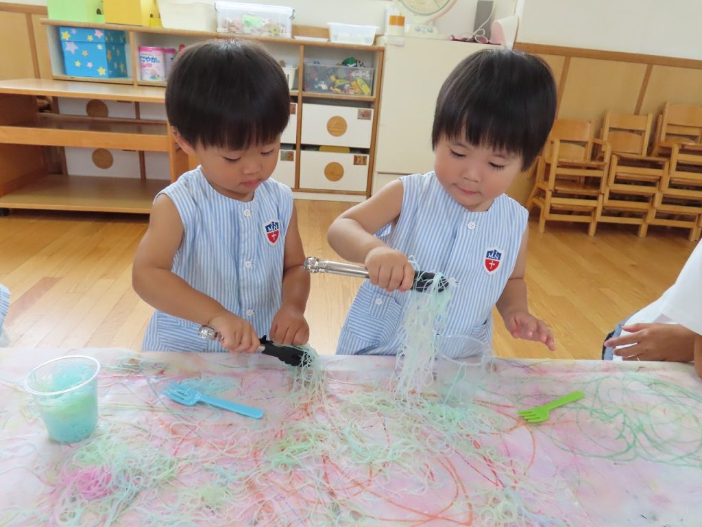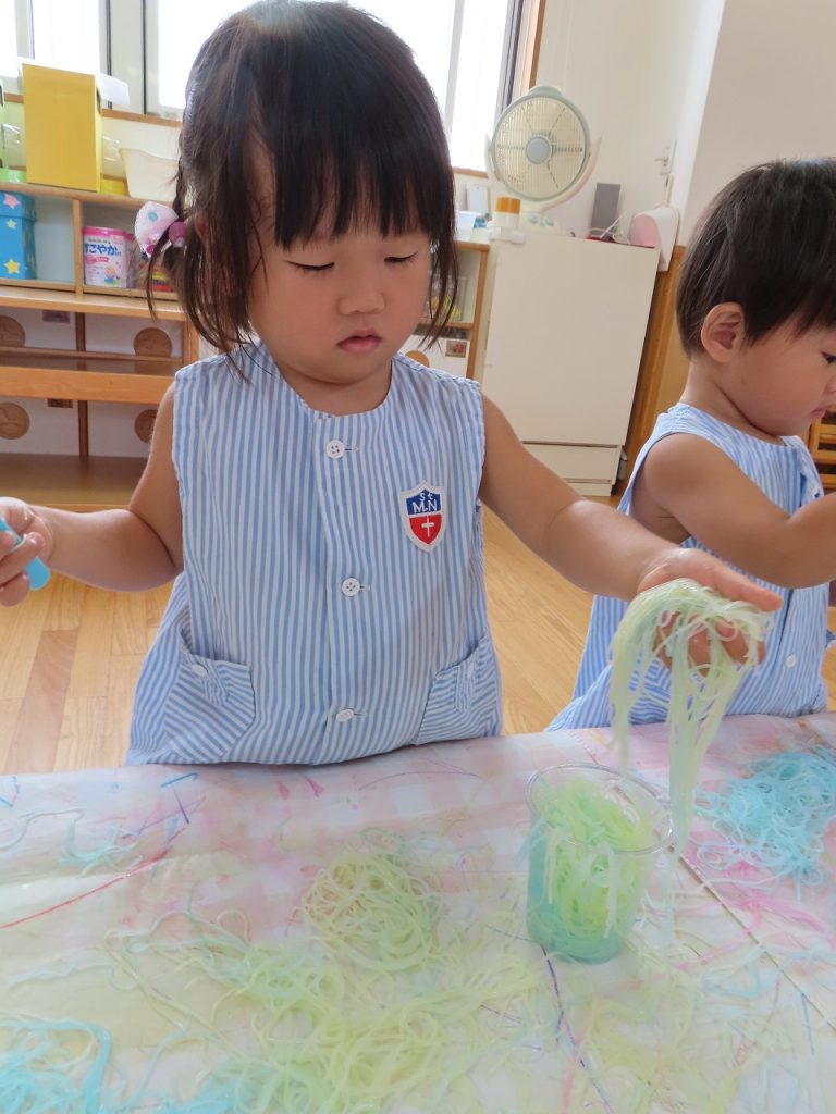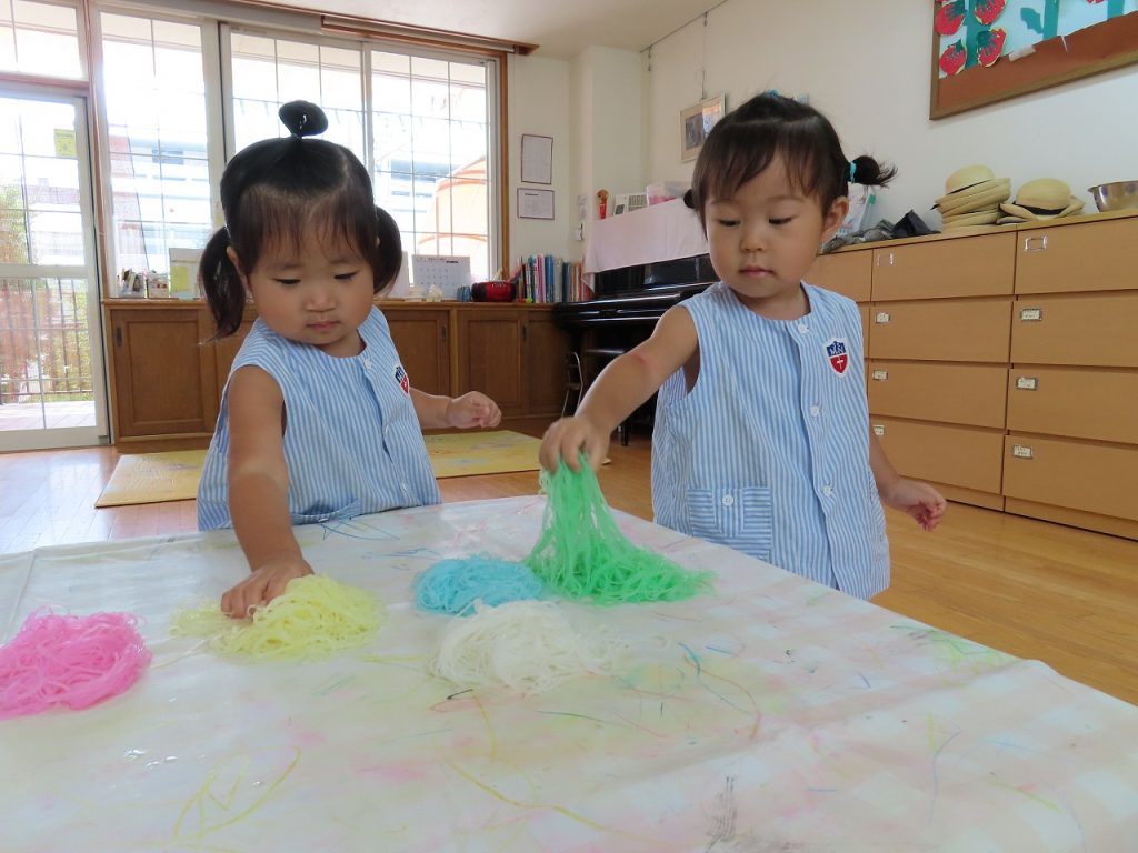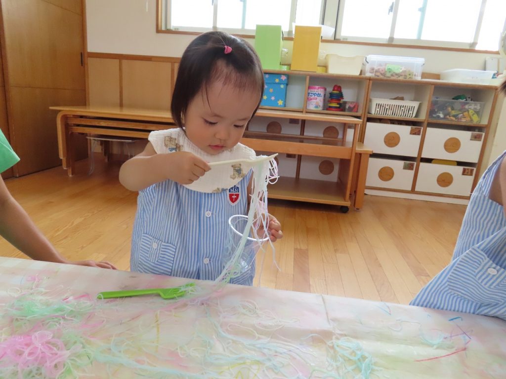 最後は、私たちも初めての春雨。いつも給食で食べているので口に入れないかな…と思っていましたが、誰も食べることはありませんでした。感触あそびが苦手な子も春雨は大丈夫!手で春雨の感触を存分に楽しみ、カップやフォーク、トングを出すとより楽しみ集中して遊んでいました。