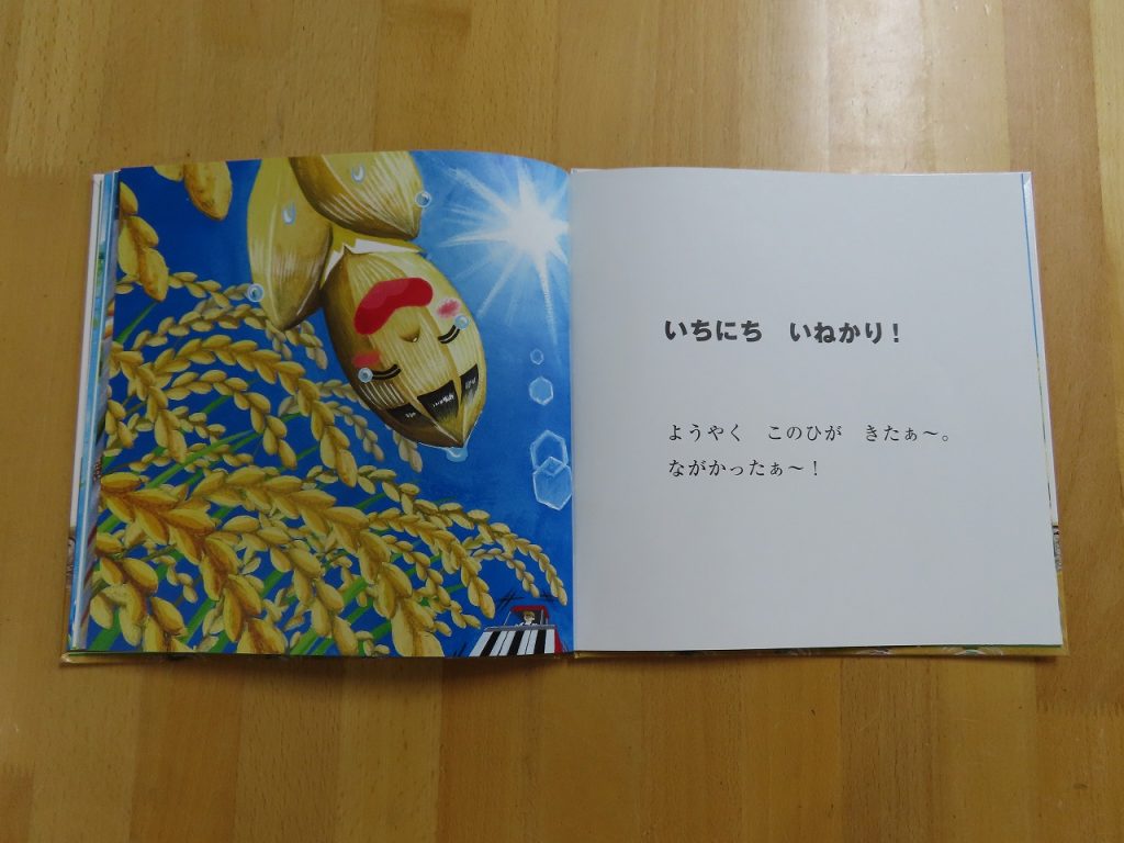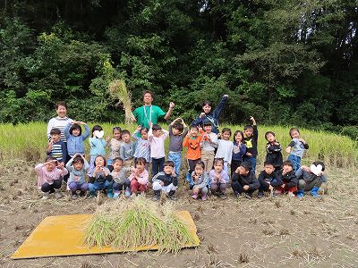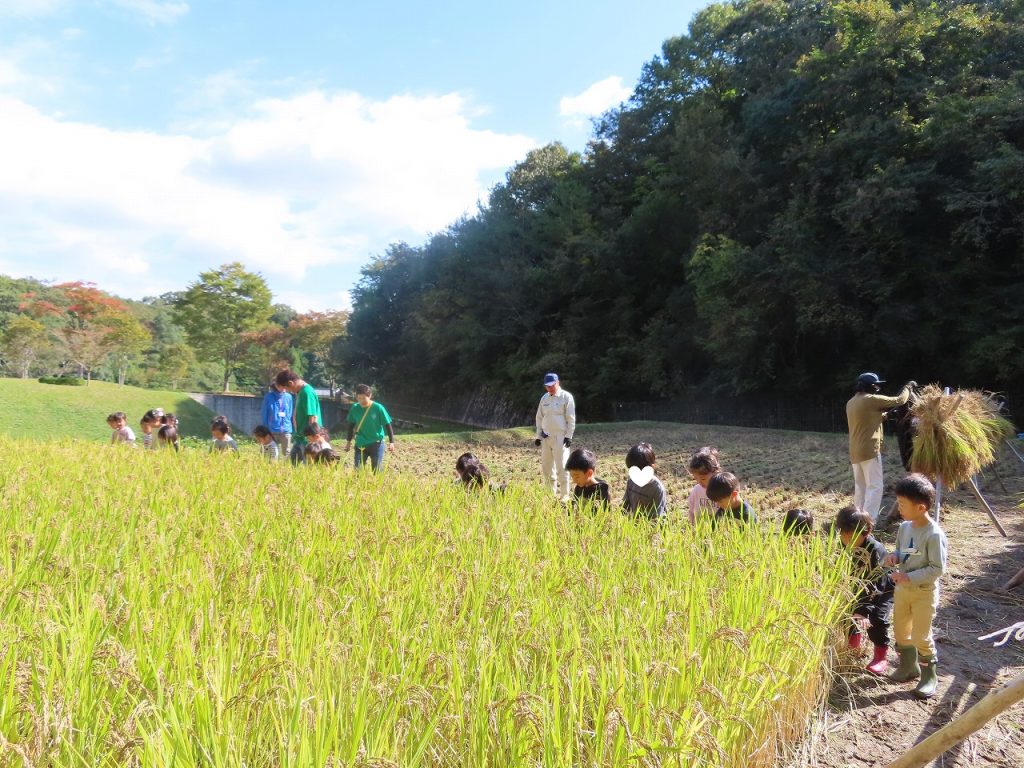 丹波並木道中央公園へ『稲刈り』に出掛けました。5月に田植えをしてから半年が経ちました。さくら組は、稲がどんなに大きくなったか「いちにち おこめ」という絵本を読んでもらい想像しワクワク当日を迎えました。“ようやくこのひがきたぁ~。”に共感。