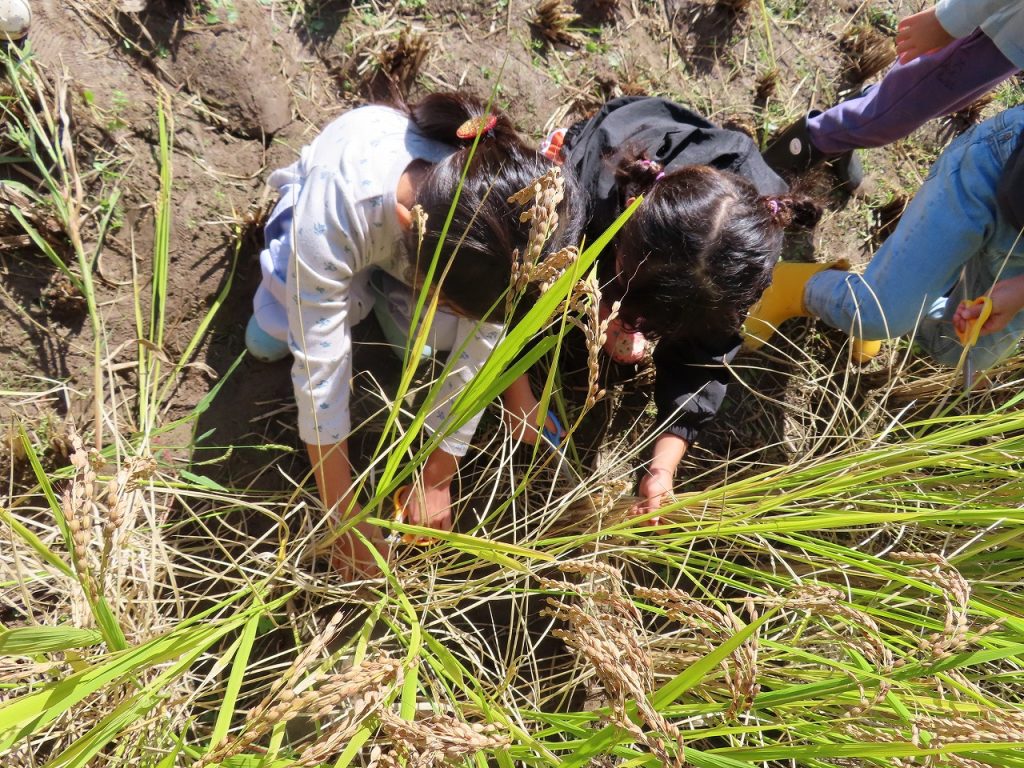 誰が一番長い稲を刈れるのか競い合ったり、一緒に切ったり・・・とても貴重な体験をすることができました。