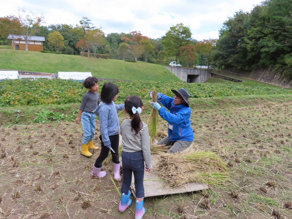 ここからスタッフの方が刈った稲を結んで干してくださるのを見学。そして脱穀して、精米したものが12月にみんなの元に届きます。「もっと美味しくなってね~💛」とパワーを送りました。