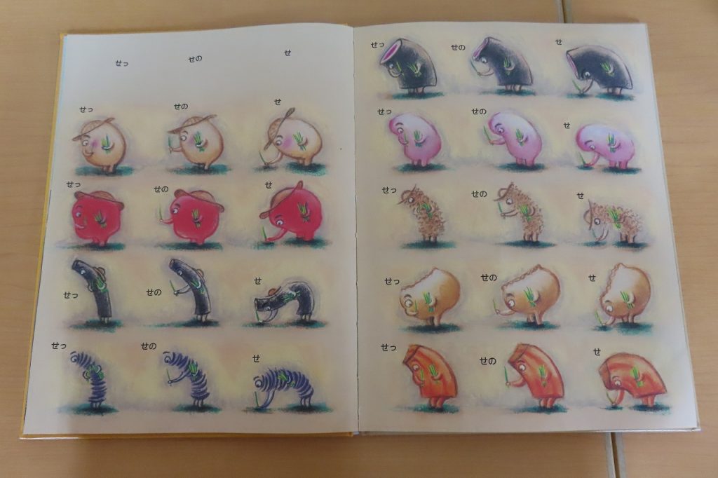 丹波並木道中央公園へ『稲刈り』に出掛けました。5月に田植えをしてから半年が経ちました。さくら組は、稲がどんなに大きくなったか「いちにち おこめ」という絵本を読んでもらい想像しワクワク当日を迎えました。“ようやくこのひがきたぁ~。”に共感。