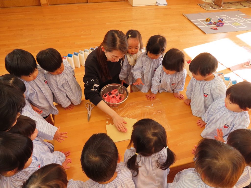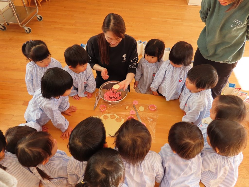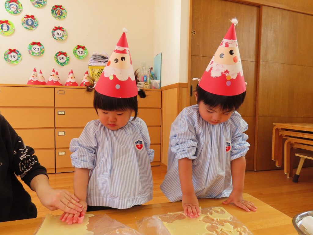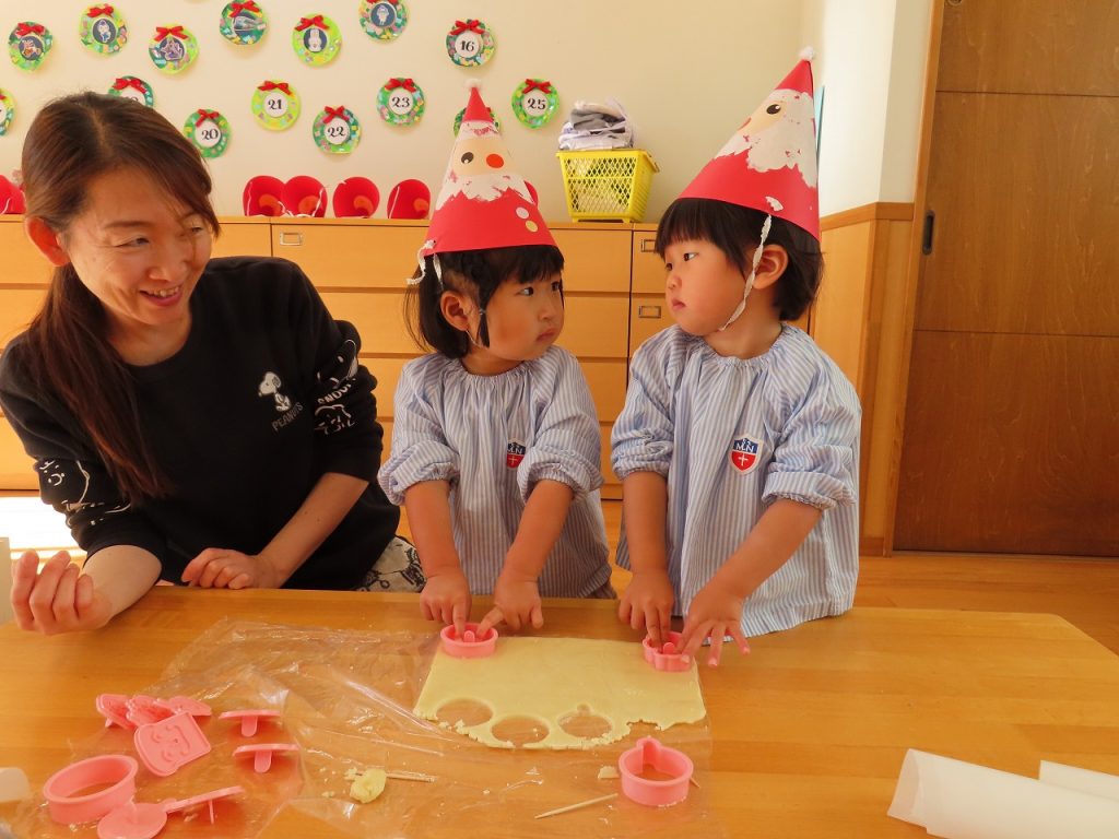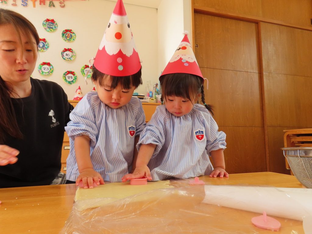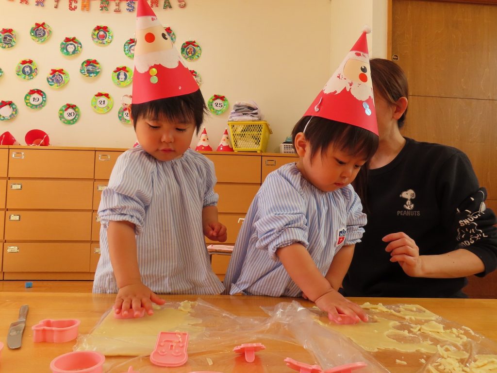 二つ目の大きな行事であるクリスマス会。ドキドキする中よく頑張っていましたね。そんな子ども達と少し早めのクリスマスパーティー。ひよこ組は食べることが大好き!特に15時のおやつを毎日楽しみにしています。今回はクッキー作りに挑戦!!せっかくなら、子どもが大好きなあのキャラクタークッキーを作ろう~ってことに・・・