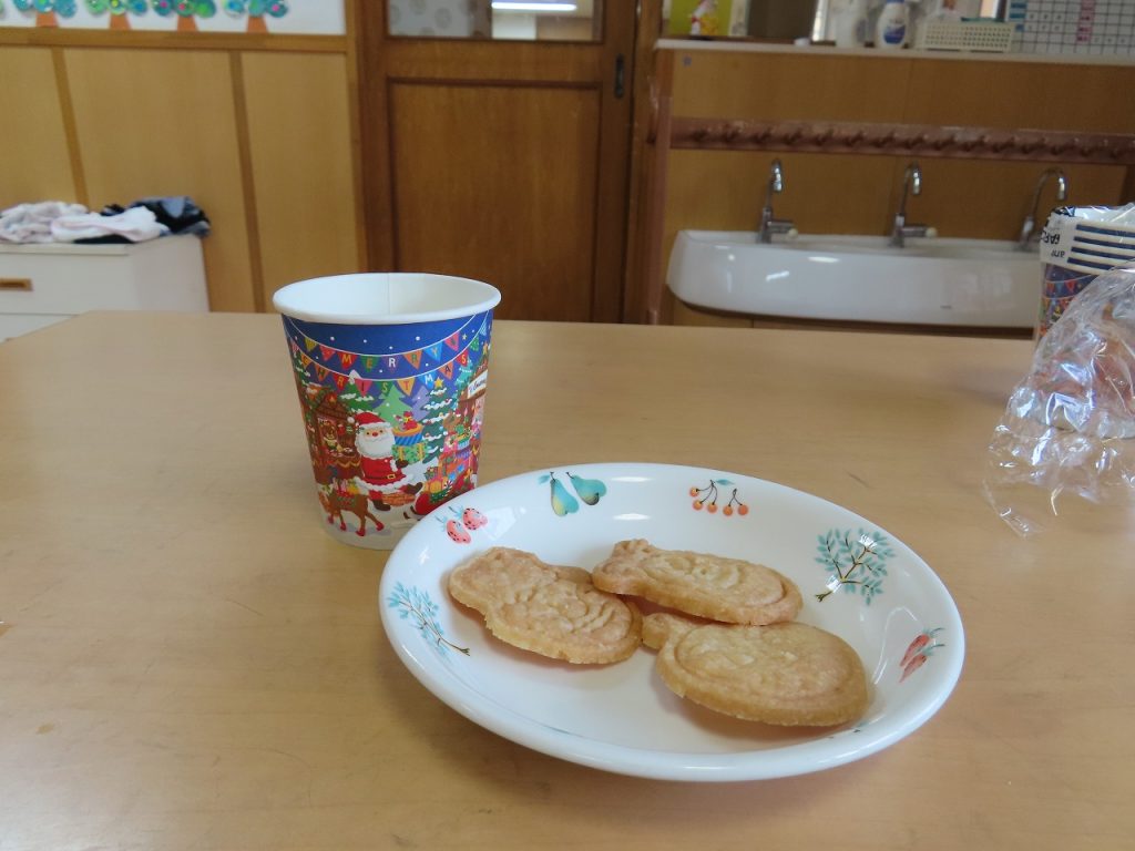 今日のおやつは牛乳とクッキー。コップもクリスマス仕様。サンタさんのコップに興味津々!