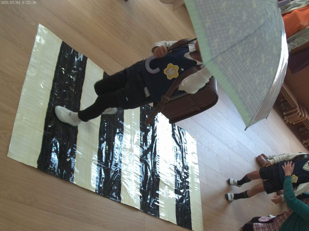 交通安全のDVDを見たあとに、年長組さんは小学校入学に向けて実際にランドセルを背負って横断歩道を渡る練習をしました。