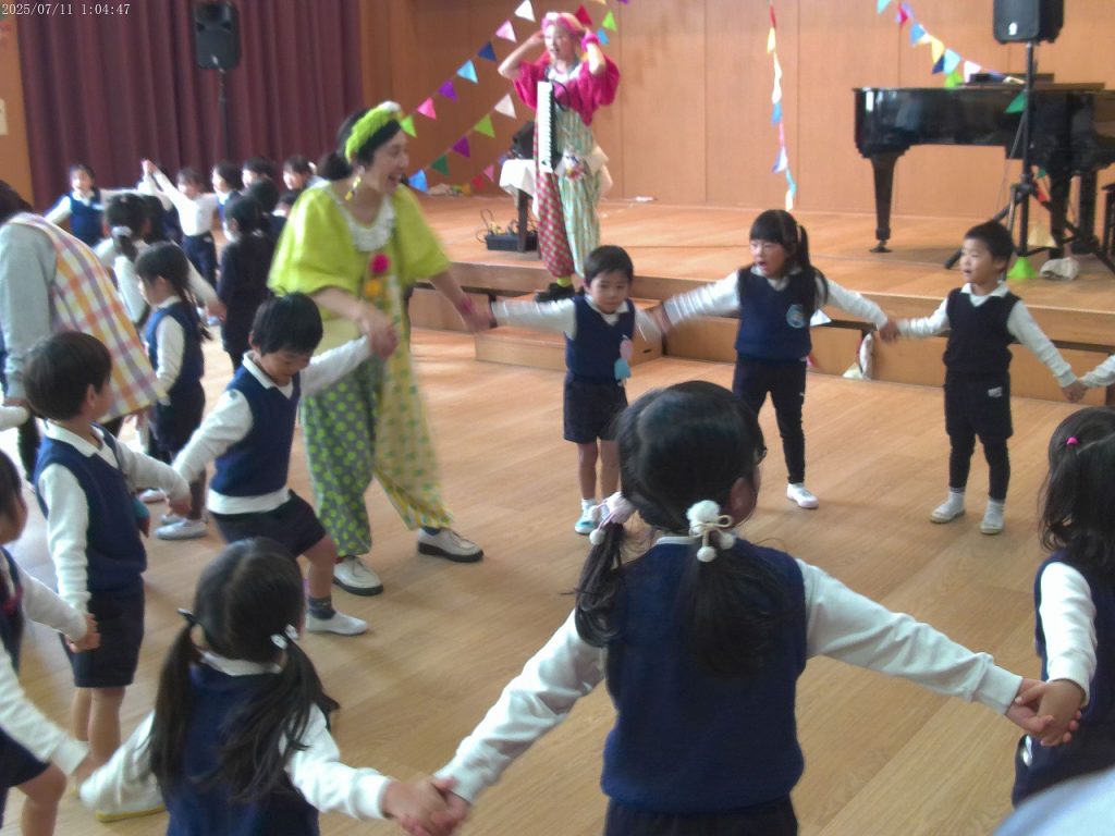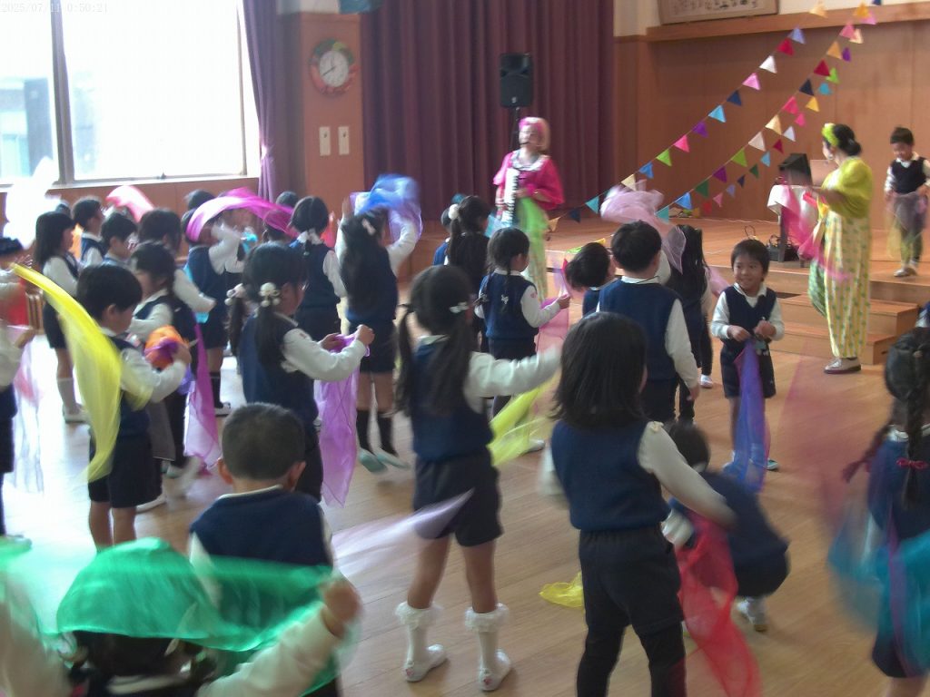 最後は観に来てくださっていた保護者のみなさんも巻き込んで楽器を鳴らしたり、ふわふわのカラフルな布を振り回したりと大興奮☆