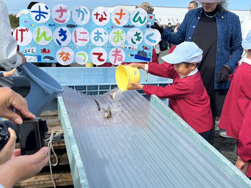 みんなが元気に大きくなるために他の生き物の命を頂いているということに感謝の気持ちを込めて、たくさんのお魚を海に放流することができました。