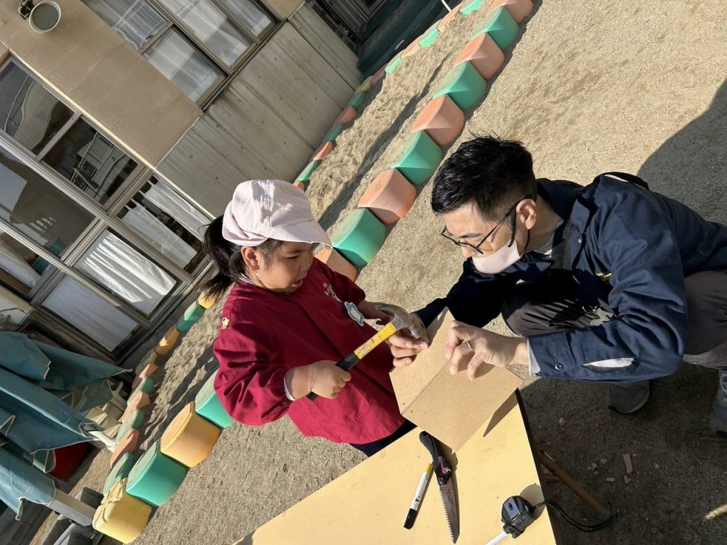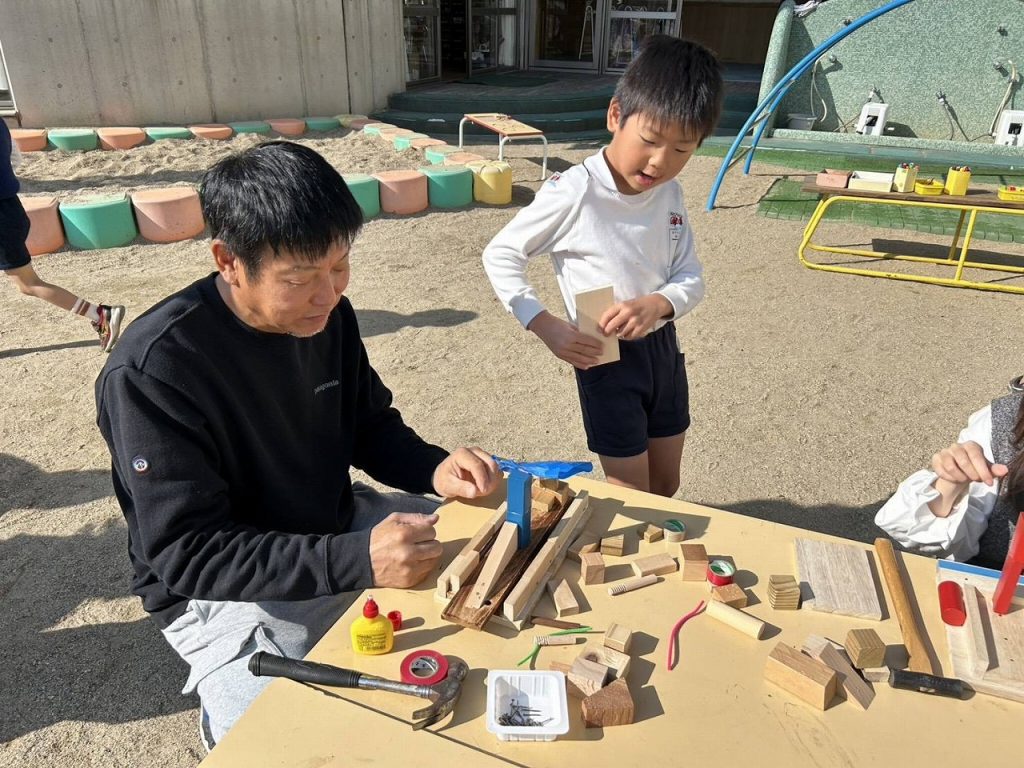 幼稚園で用意した木材やお家から持ってきた廃材を使って好きなものを作ります。
