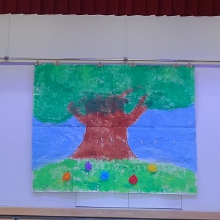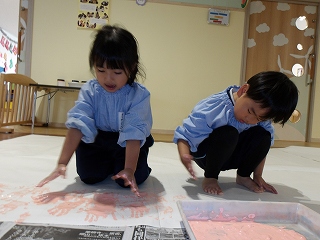 この日はおふろごっこに必要な森とお風呂を作ってみない?と子どもたちに話をしてみると「やりたい!」「つくりたい!」と気合十分に作ってくれました!きっと体操ズボンやスモック、手や足が絵の具で汚れて帰った日があったと思います・・・。それは子どもたちが頑張って作った証ですので、壁面や大道具(お風呂など)にもご注目してご覧ください👀⭐