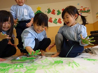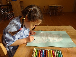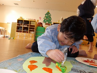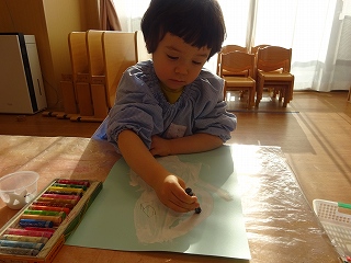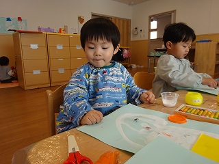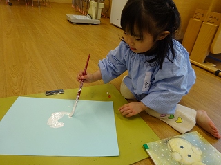 絵の具を使って、雪だるまを作成しました。初めて絵筆を手にしましたが、上手に丸を描くことが出来ていましたよ!
