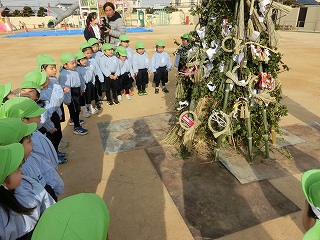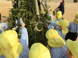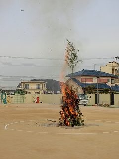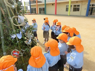 1月15日(木)はとんど祭りでした。地域でも見る機会がほとんどなくなったとんど焼きを行い、お正月や干支などについて知る機会となっています。また、姉妹園の学園幼稚園の年長さんと一緒に行い、親交を深める時間にもなっています。