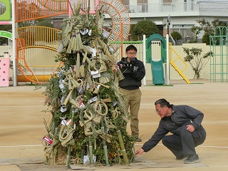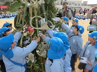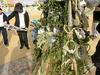 会を始める前に、子どもたちが家から持ってきたしめ縄や書初めを櫓にかけたり、入れ込んだりしました。