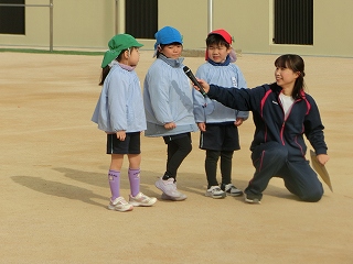 12月19日は2学期最終日でした。長かった2学期を振り返り、冬休みを家で過ごす子も園で過ごす子も元気に楽しく過ごせるように2学期終業式をしました。まず、園長先生のお話の後、みんなでどんな出来事があったか振り返りました。