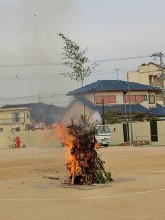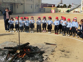 司会の子どもたちが理事長先生に火入れをお願いしました。理事長先生が櫓に火を入れると、勢いよく燃え上がる様子に子どもたちは大興奮です。「とんどや、とんど」と掛け声をかけ、一層盛り上がっていきました。
