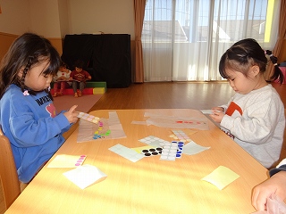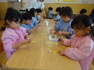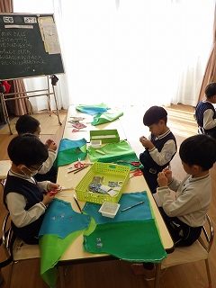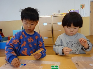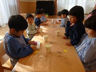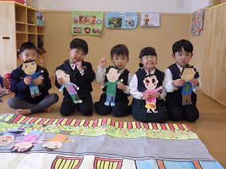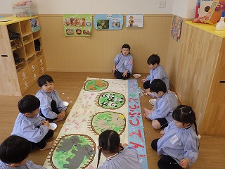 満3クラスで過ごすのも残り2か月になりました。もうすぐ年少さん✨と言うことで、3学期に入り、「年少さんになったら・・・」と期待がもてるような話をたくさん話をするようにしました。子どもたちは、お兄さん、お姉さんになることをとても楽しみにしていて、姿勢を正して話を聞くように意識したり、「制服買ったよ!!」「はさみも買った!」と教えてくれたりする子どもの姿が見られました。