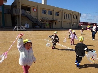 手を懸命に上にあげて沢山走っています💨風が強く園外に凧が飛ばされてしまう子どももいましたが、それも思い出の一つですね😆♥️