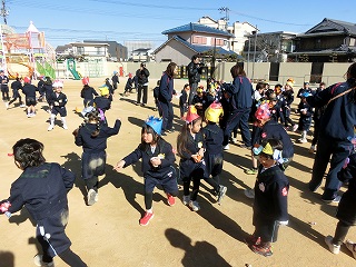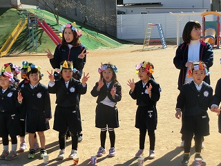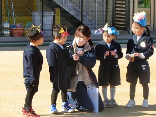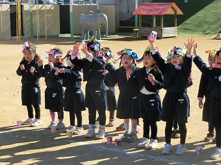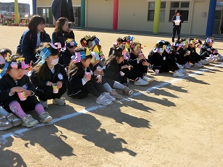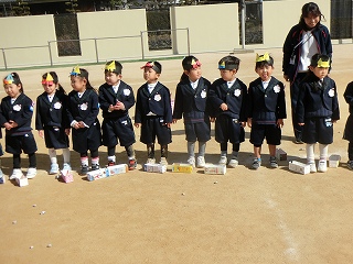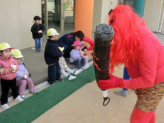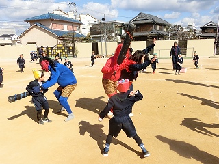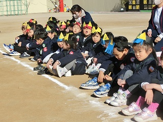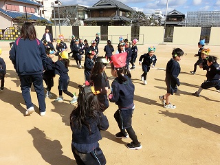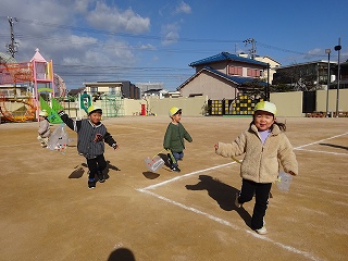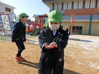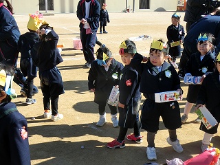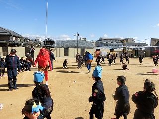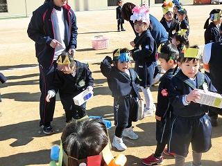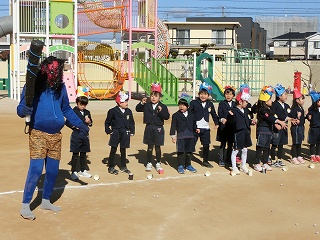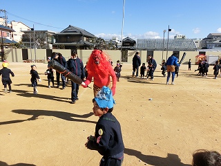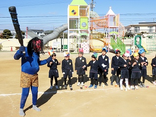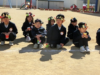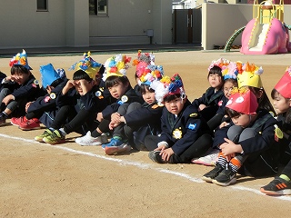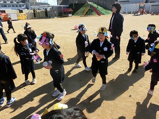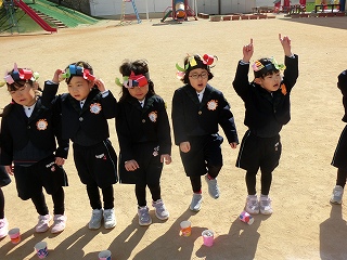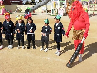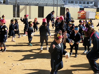 2月3日(火)は節分でした。数日前から子どもたちが「鬼来るねんなあ。」「鬼なんかこわくないで。」と声をかけてきました。ちょっと強がっているようで節分が来るのをドキドキして待っているようでした。この日は、自分たちで作った鬼の被り物を頭につけ、家で作った新聞紙の豆をこれも自作の入れ物いれて園庭に集まりました。