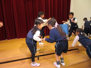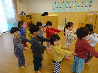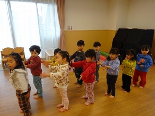 そこに、園長先生が柊と鰯の頭をもってやってきて、鬼を弱らせてくれました。そして、鬼が悪さをしない約束をしたので、子どもたちも仲良しになろうと握手をして、一緒に歌や踊りを楽しみました。