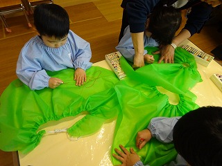 衣装づくりでは日頃から遊びの中で取り入れていた、縫い取りに挑戦!針と毛糸を使ってベストを縫ったり、エプロンの模様を縫ったりしました。