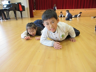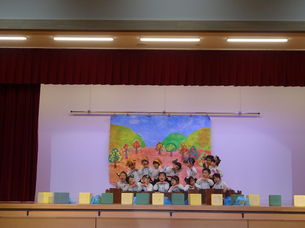 大ホールで表現遊びをすると、保育室と違う広さに圧倒され動きが小さくなってしまう子ども達でしたが、練習を重ねると段々動きが大きくなってきました。自分の思う動物の動きを伸び伸びと表現する事を楽しみながら、保護者の方に見てもらえることを楽しみに練習に励んでいます😊