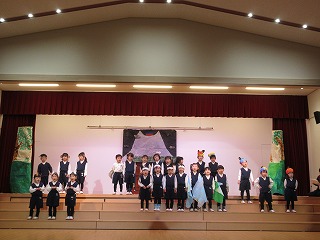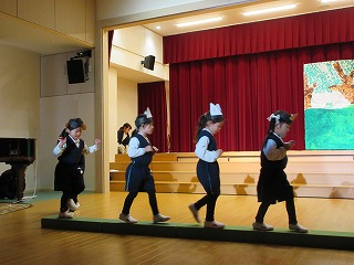 衣装作りでは、障子紙を重ねて帽子を作ったり、何日もかけて服の縫い取りをしたり、ワッペンを付けたりして一人一人可愛らしい衣装ができました。衣装を身に付けて練習をするとワクワクした表情で舞台に上がる子どもたちです♪