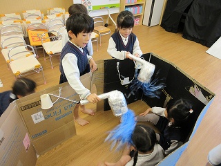 2学期が始まると、「バルバルさんに出てくるお風呂を作りたい!」と子ども達から話があり、段ボールやペットボトル、ラップの芯などを使ってお風呂作りが始まりました。お風呂が完成すると、色々な動物になって「綺麗にしてください」と遊びが始まりました♪