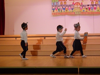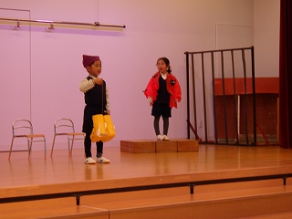 衣装ができると、子ども達はワクワクした表情を見せ、劇への取り組みがさらに意欲的になりました!台詞を考える時には、「こういったらどうかな?」「大きな声で言わないとママパパに聞こえないよね」と話しながら練習を進めていきました。