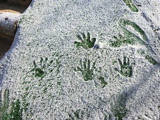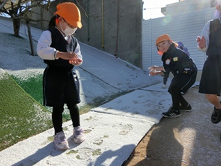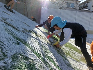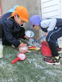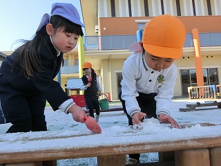 週明けの2月9日は、今年一番の冷え込みになりました。園庭は、昨日の雪が残り、水が溜まっていたところには厚めの氷が張っていました。こんな日は大人にとって憂鬱なのですが、子どもたちは違います。いつもとの違いに興奮し、寒くても外に出たくて仕方ありません。みんなが登園してくると、各学級で外遊びが始まりました。冷たいはずなのに手を真っ赤にしても雪集めや氷取りに必死です。「先生、暑くなったわ。」と声をかけてくれた子の額にうっすらと汗が浮かんでいます。非日常の朝を楽しむ子どもたちでした。
