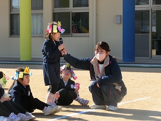 まず、先生から節分のお話を聞いたり、クイズに答えたり、クラスの代表のお友達が頭の被り物について説明したりしました。