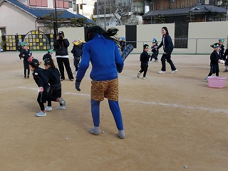 次は、みんなが待っていた豆まきの時間です。男の子と女の子が鬼を交代しながら豆まきを楽しみました。