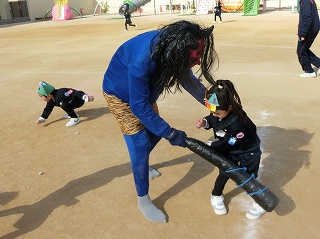 この後、鬼さんは満3歳学級とわくわま教室の子どもたちとも、関わってくれました。