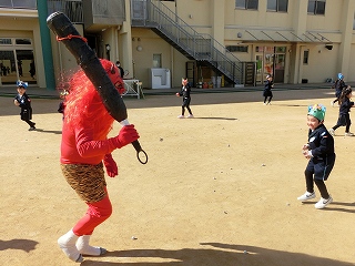 しばらくすると、太鼓の音が聞こえてきました。なんとなく不穏な空気です。そして、本物の鬼が子どもたちの前に現れました。驚いて逃げ惑う子、動けなくなってしまう子、果敢に豆を投げつける子、それぞれが大変です。