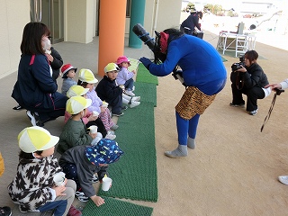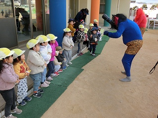 名高いくまさかとらえもん先生やおかしな生徒たちのキャラクターになりきることが難しかったきりん組。恥ずかしさや緊張からなかなか声も出でなかった子どもたちでした。