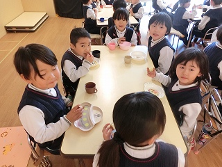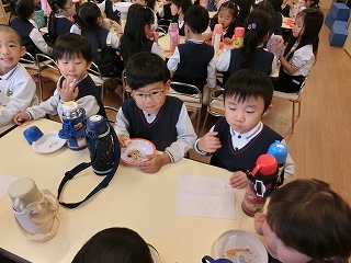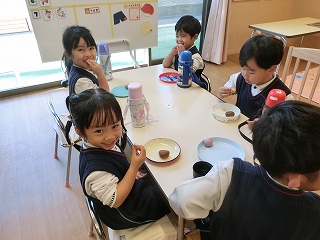12月15日(月)の朝は幼稚園にクリスマスソングが流れ、父母の会の方用意していただいたドーナッツを食べることからスタートしました。いつもと違う1日になりそうで、子どもたちはちょっと落ち着きません。