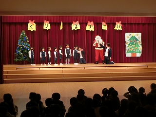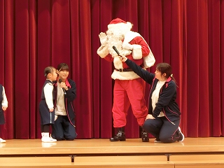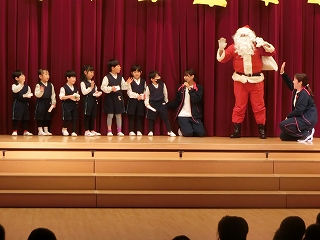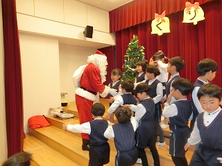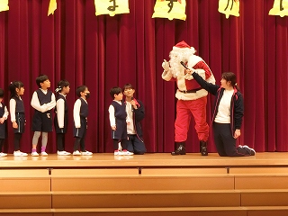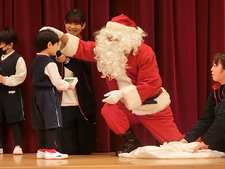 この日は、子どもたちが楽しみにしていた「クリスマス会」です。目の前に現れたサンタクロースに大歓声が沸きました。お迎えの「あわてんぼうのサンタクロース」をみんなで歌い、会が始まりました。まず、サンタさんに教えてほしいことを尋ねてみました。「好きなお菓子は何ですか。」「真っ赤なイチゴがのったショートケーキと体温まるホットミルクだよ。」と一つ一つ丁寧に答えてもらうことができました。「ケーキとミルクは私も好きだよ。」とほほ笑む様子もとても可愛かったです。