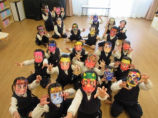 個性溢れる鬼のお面がとても可愛くて互いのお面を見合いながら「ツノの色めっちゃかっこいい!」「カラフルな鬼もいいね!」と褒めて楽しんでいました⭐