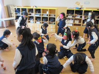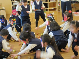 そして2チームに分かれて豆まきごっこをして遊びました!白熱した豆まきごっこ🔥「鬼は外!福は内!」の大きな声が響きながら楽しんでいました✨そして最後には…「先生をやっつけろ!」といっぱい豆を投げられ子ども達にやられてしまいました💦