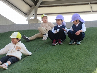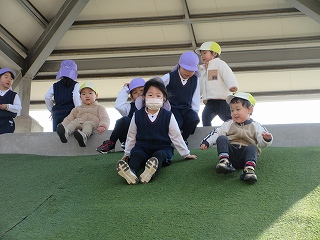 すみれ組は戸外遊びでみかん組のお友達とも遊びました!「みかん組さんと遊びたい!」とずっと言っていたので一緒に遊ぶことができて嬉しそうでした💕お山に登る際も先に歩いてあげる役と、下から見守ってあげる役に分かれてみかん組さんをサポートする姿が印象的でした✨「せーの!」の掛け声で滑ってくる姿は微笑ましかったです☺